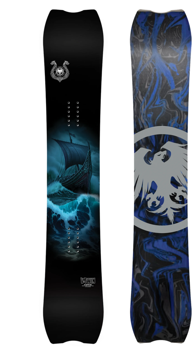 The V-Twin pays homage to the Valhalla. It’s more than just an all-mountain board, excelling in any terrain or conditions. The V-Twin is extremely energetic and responsive, helping you go faster, edge harder, hold an edge longer, and boost higher. Its powerful flex, Hybrid Triple Camber profile, and extended contact points offer unmatched grip on icy runs, while durable aluminum tip and tail protectors add style and protection. The V-Twin is powerful when you need it, playful when you want it, and amazing everywhere.